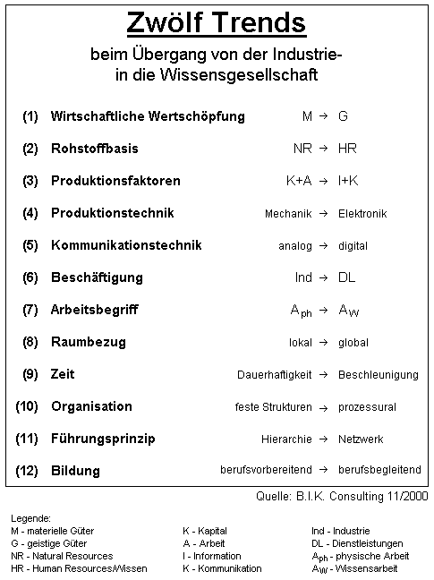 Der in dem Zitat angesprochene Übergang von der materie-orientierten Industriegesellschaft (M) in die geist-orientierte Wissensgesellschaft (G) wird durch etliche Trends gekennzeichnet, die im folgenden Schaubild aufgelistet sind.