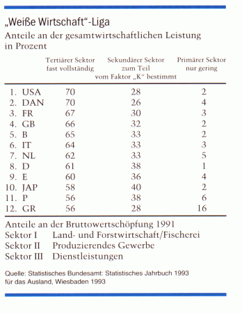 Bei der bisher schon erfolgten explosiven Auffächerung von Berufsbildern innerhalb des tertiären Sektors sollte es nicht schwerfallen, sich immer neue Tätigkeitsbereiche mit praktisch unbegrenztem Zuwachspotential an neuen Berufsfeldern vorzustellen. Bereits heute sind in Deutschland 75 Prozent der Erwerbstätigen - egal ob sie im produzierenden Gewerbe oder im Dienstleistungssektor arbeiten - mit Dienstleistungsfunktionen befaßt, die sich durch überwiegend kommunikative Tätigkeitsmerkmale auszeichnen. Während der Faktor "K" im industriellen Sektor zur Vernichtung von Arbeitsplätzen beiträgt, produziert er in der "weißen Wirtschaft" neue Berufe in Fülle und Vielfalt. Die damit einhergehende enorme Ausweitung der Wirtschaftsleistung hatte bereits in den letzten 30 Jahren ein sehr dynamisches Wirtschaftswachstum des Dienstleistungssektors zur Folge. Bei einer absoluten Verdreizehnfachung seiner Wertschöpfung von 1960 bis 1992 hat er seinen Anteil an der gesamtwirtschaftlichen Leistung von 41 Prozent auf 61 Prozent sprunghaft ausgeweitet. Japan gehört wie Deutschland zu den Ländern, die sich nur relativ zäh aus ihrer Industrie-Tradition lösen und gegenüber Ländern wie USA und Dänemark auf diesem Gebiet noch einiges aufzuholen haben.