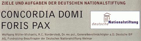 Unter den rund zehntausend deutschen Stiftungen rangiert die Deutsche Nationalstiftung von ihrer finanziellen Ausstattung her eher in den unteren Rängen. Ihre Ziele indessen, aktiv an der Überwindung der Teilungsfolgen mitzuwirken, zugleich den Aufbau der europäischen Union und hier vor allem die Beziehungen zu unseren unmittelbaren Nachbarn Frankreich und Polen zu fördern, stehen ganz oben auf der Agenda. So könnte der Spruch über dem Lübecker Holstentor CONCORDIA DOMI FORIS PAX (Eintracht im Innern, Friede nach außen), der einen zeitlosen Auftrag an die Politik beschreibt, als sinnfälliger Ausdruck der Stiftungsidee gelten.