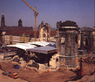 Bauherr des Wiederaufbaus der weltberühmten protestantischen Barock-Kirche ist die 1994 gegründete Stiftung Frauenkirche Dresden, für die Bundespräsident Roman Herzog die Schirmherrschaft übernommen hat. Die von 1726 bis 1743 von George Bähr erbaute Kirche wurde kurz vor Kriegsende, im Februar 1945, total zerstört. Bei der inzwischen abgeschlossenen archäologischen Enttrümmerung und bei der Rekonstruktion des Bauwerks treffen Bauhandwerkskunst des 18. Jahrhunderts und modernste Technik des 20. Jahrhunderts aufeinander. Von den abgetragenen 22 000 Kubikmetern Trümmer konnte ein Teil der historischen Bausubstanz für den Wiederaufbau geborgen werden. Mit Hilfe eines einzigartigen Verfahrens elektronischer Erfassung wird gut ein Drittel des Fassaden- und Hintergrundsteine bei der Rekonstruktion wieder Verwendung finden. Die Nettobaukosten für den Wiederaufbau wurden mit ca. 250 Millionen DM ermittelt. Sie sollen aus privaten Spenden, aber auch aus öffentlichen Mitteln aufgebracht werden. Ein wichtiges Finanzierungsmittel ist der Stifterbrief, der in Zusammenarbeit von Stiftung und Dresdner Bank herausgegeben wird. Die Frauenkirche soll bereits im Jahr 1996 im Bereich der Unterkirche für Andachten und Kammerkonzerte genutzt werden. Der Kirchraum einschließlich der inneren gewölbten Kuppel soll bis zum Jahr 2000 wiedererrichtet werden. Das Aufsetzen der Steinernen Kuppel, die der historischen Dresdner Stadtsilhouette ihre weltberühmte Kontur verliehen hat, wird vor dem 800jährigen Stadtjubiläum der Stadt Dresden im Jahr 2006 erfolgt sein. |